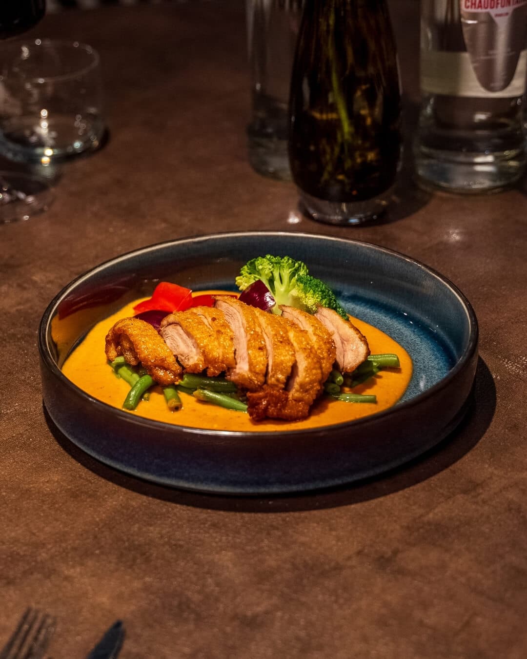 Gebakken roodbaars filet, rode curry, seizoen groeten, lente uien en eventueel koriander.