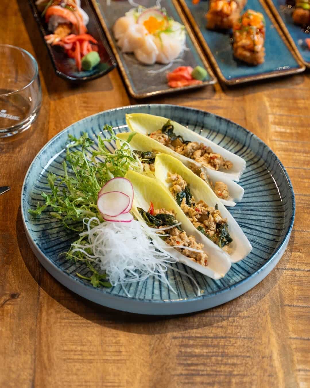 Taco gevuld met gamba, koriander, munt, taugé en een lichte Vietnamese vissaus dressing.